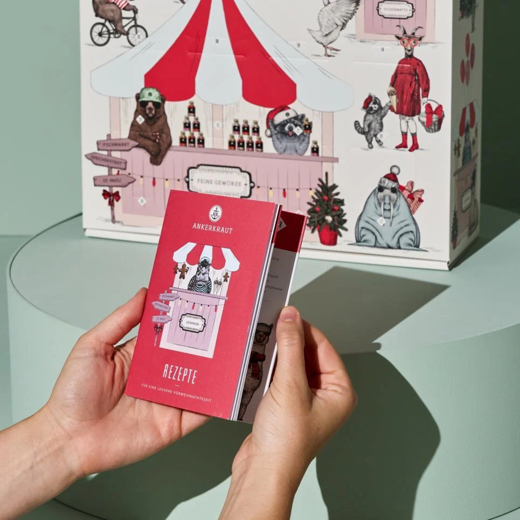 Le calendrier contient 18 mélanges présentés dans de jolis bocaux en verre avec couvercle en liège, ainsi que 6 en sachets. Un livret de recettes (uniquement en allemand) complète l’ensemble et vous donnera de nombreuses idées pour les utiliser.