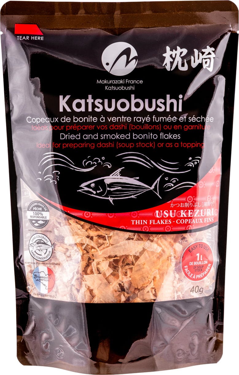 Ces fines lamelles de katsuobushi sont fabriquées en France selon un procédé traditionnel et sont riches en umami. Elles sont idéales pour préparer des bouillons classiques ou comme garniture sur des takoyaki, okonomiyaki et bien d’autres plats.