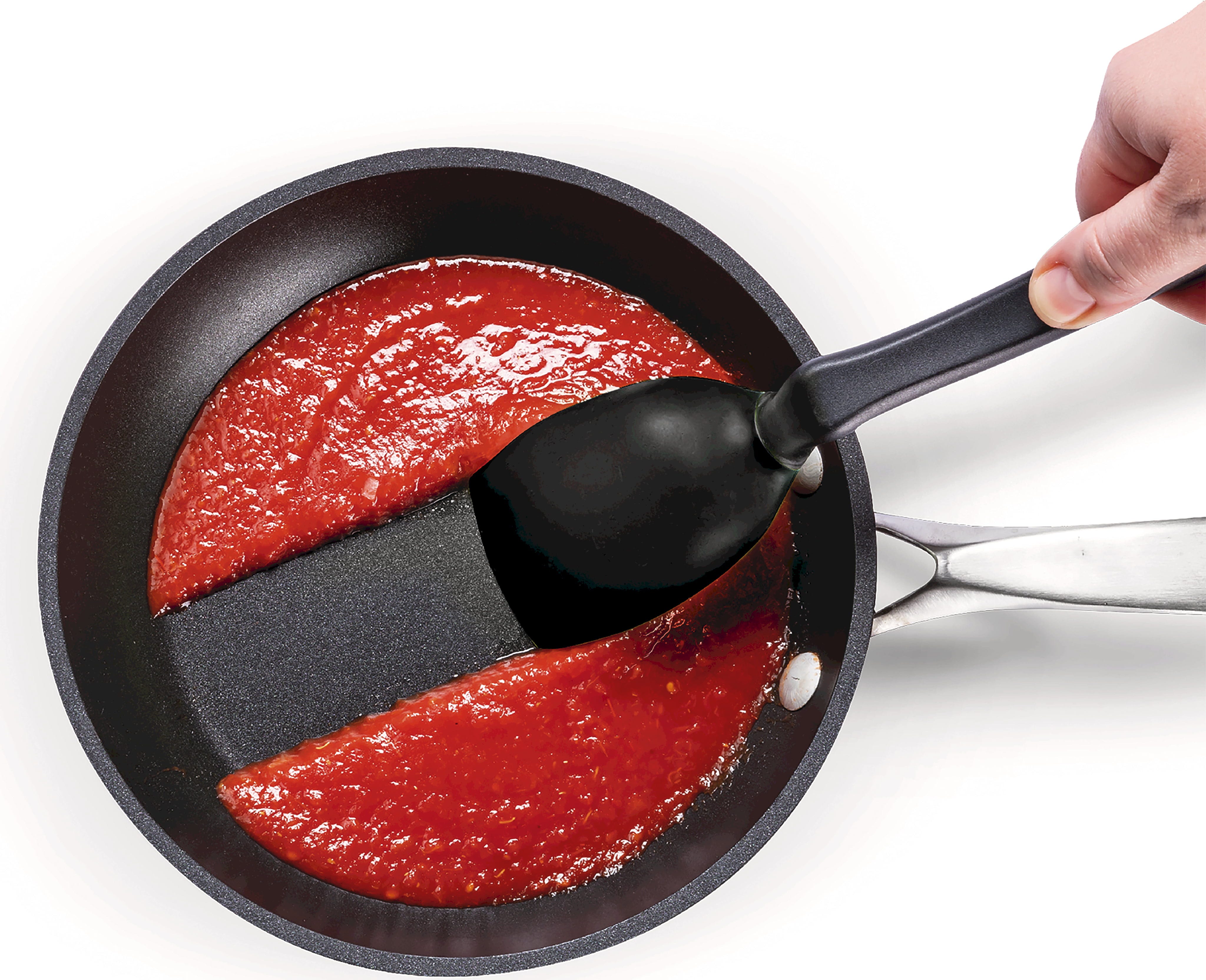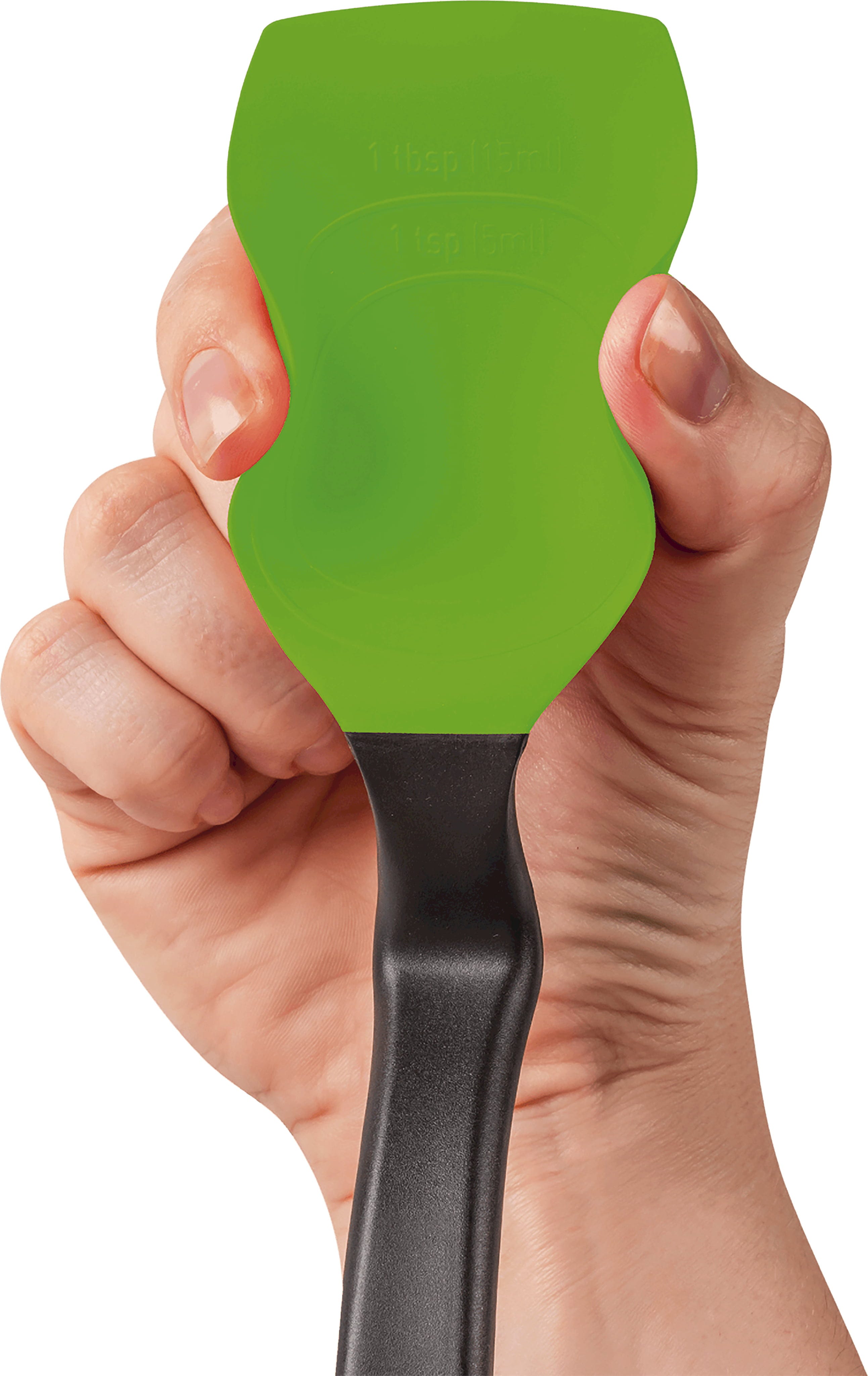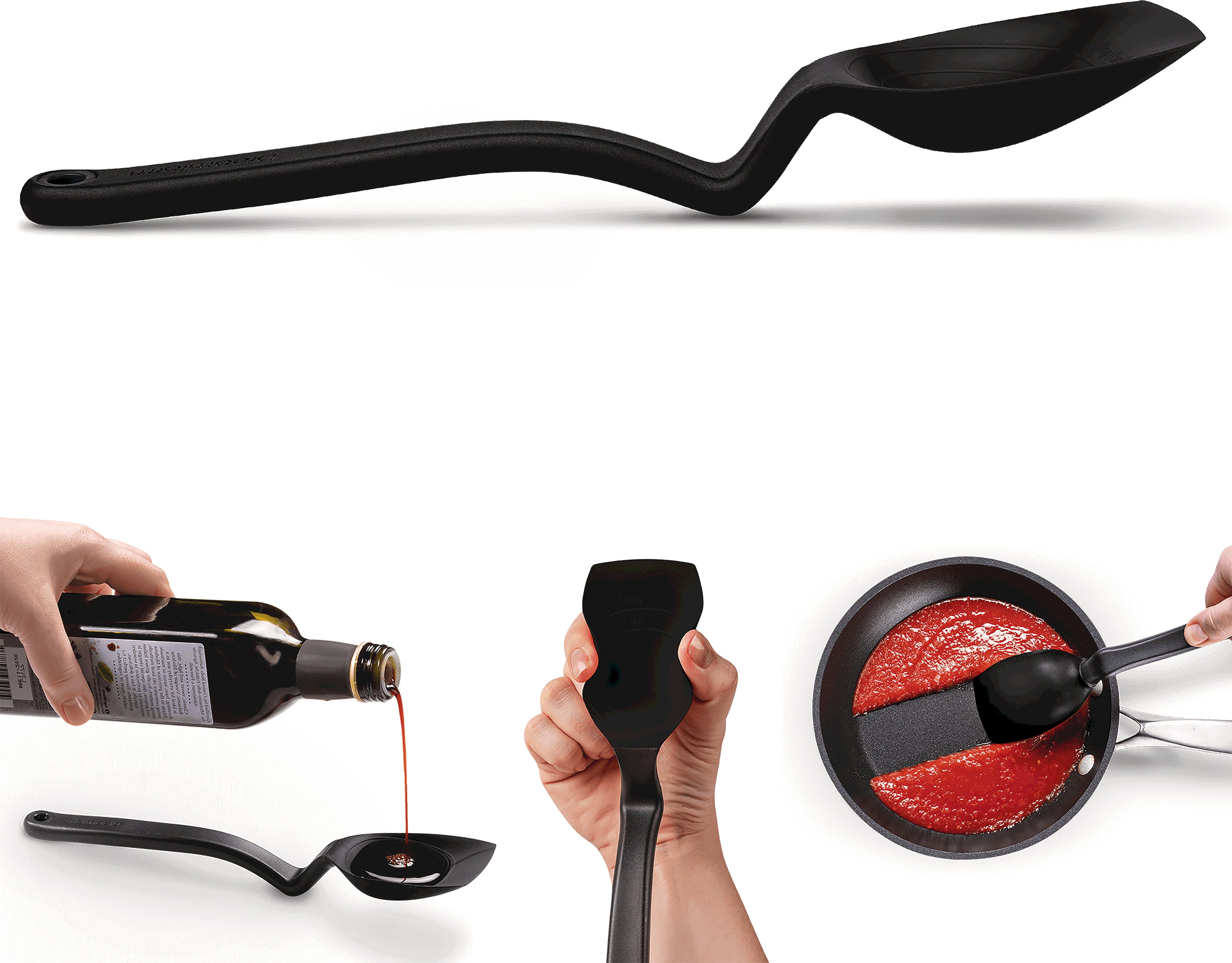 La courbure intégrée maintient la tête de la cuillère toujours surélevée du plan de travail, ce qui permet de la poser sans salir la surface. Elle peut également être accrochée directement au bord de la casserole. Les graduations intégrées permettent de mesurer précisément 15 ml (une cuillère à soupe), tandis que le Supoon résiste à la chaleur jusqu’à 260 °C.