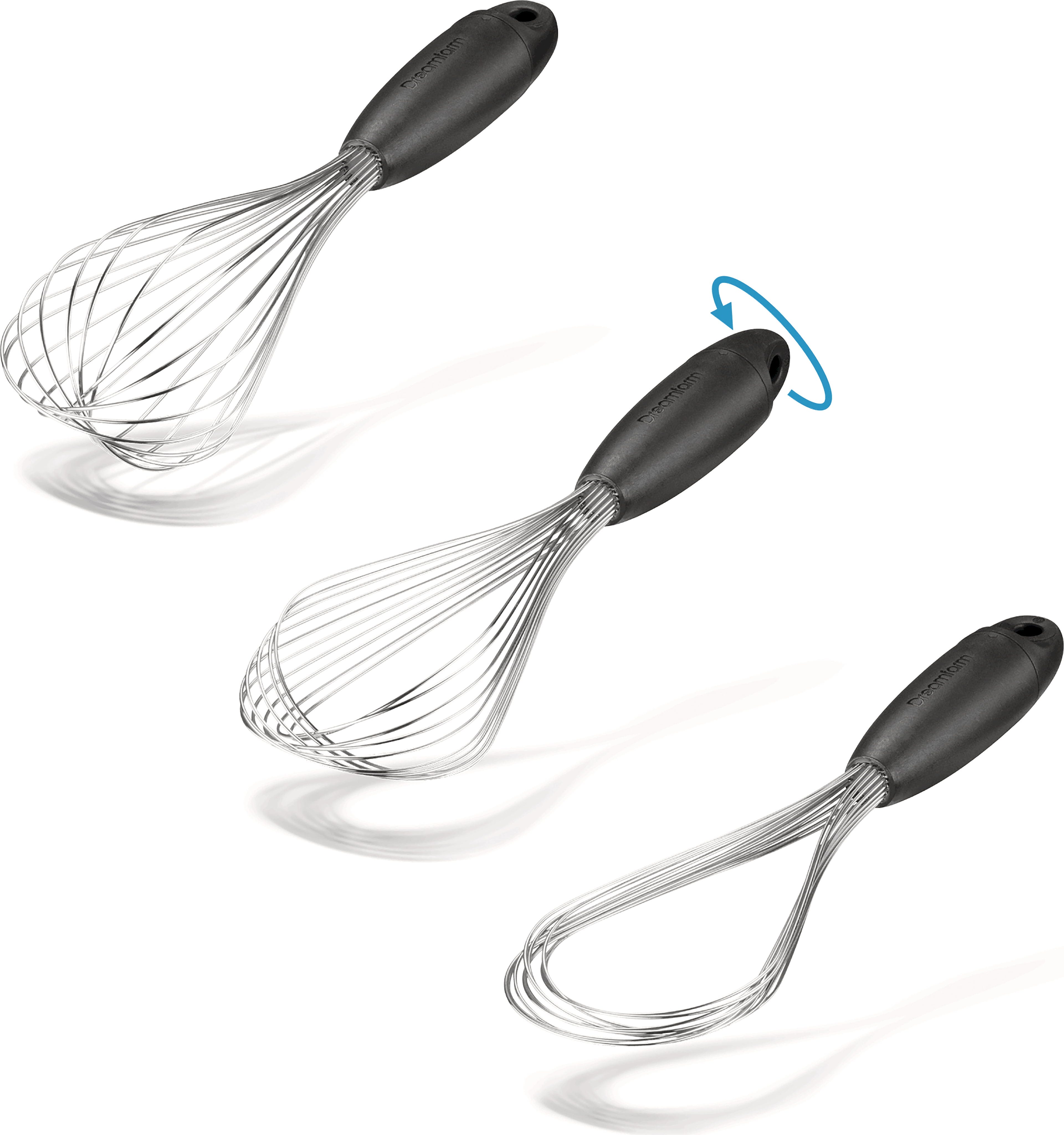 Le fouet Flisk de Dreamfarm est un fouet innovant qui se transforme en trois formes différentes par une simple rotation du manche. En position ballon, il permet de monter la crème en chantilly légère, tandis que la position plus plate est idéale pour mélanger, lier ou déglacer dans des poêles peu profondes. Après utilisation, il peut être entièrement replié à plat, ce qui le rend extrêmement peu encombrant dans le tiroir à ustensiles et évite qu’il ne s’emmêle avec d’autres accessoires.
