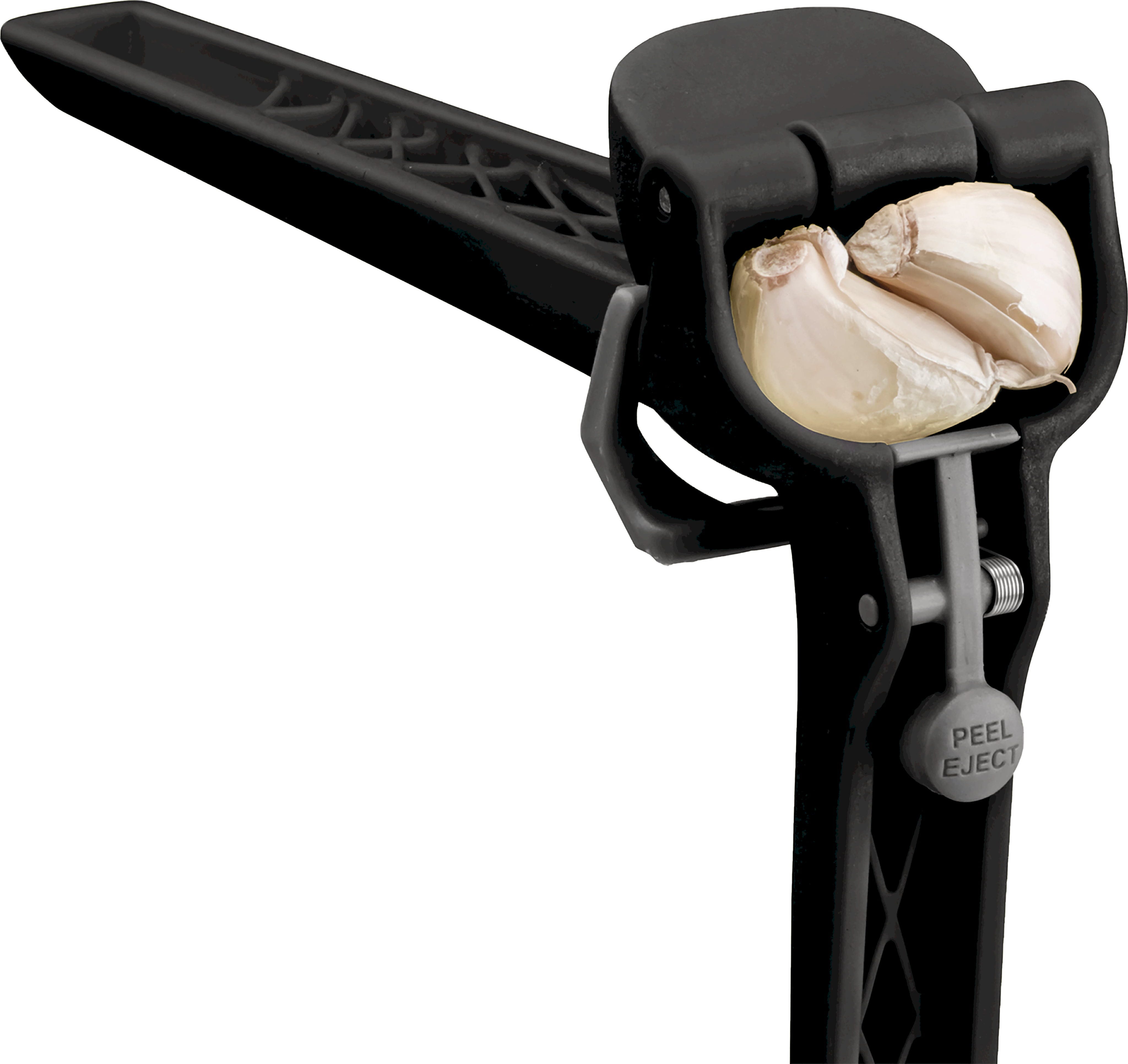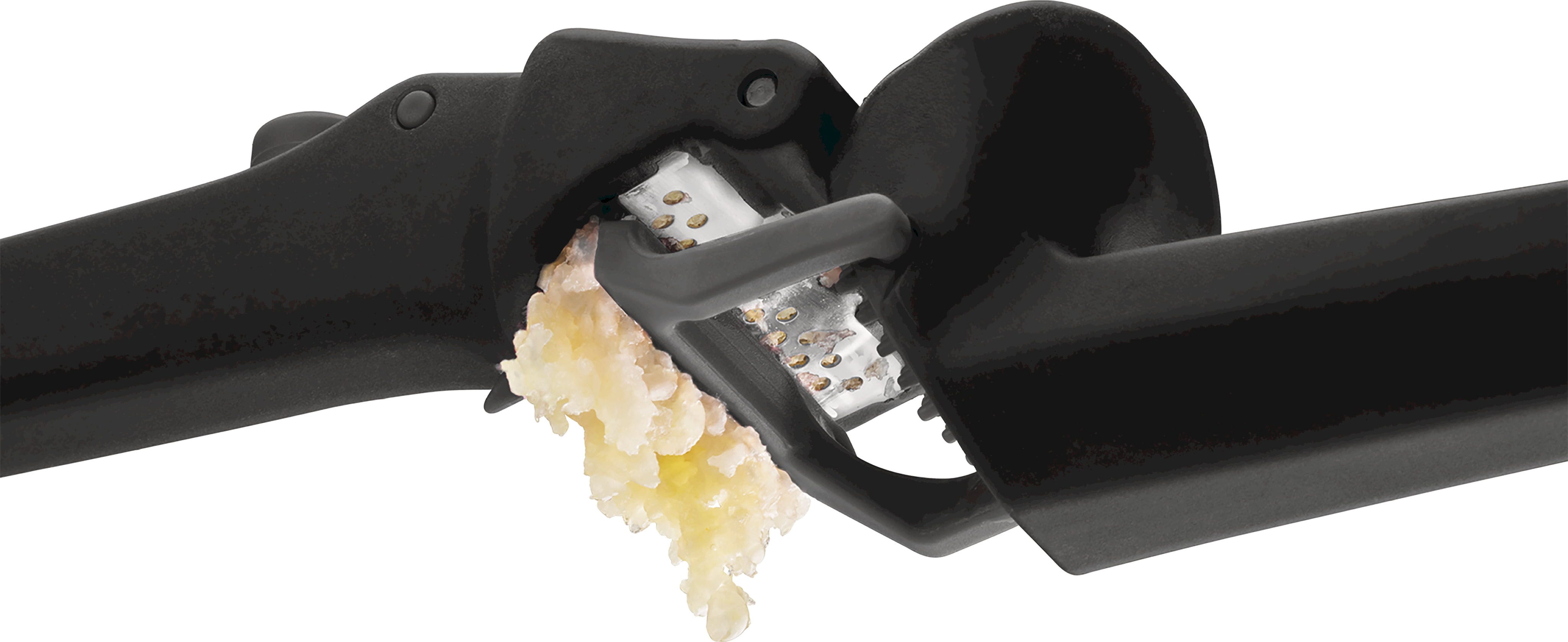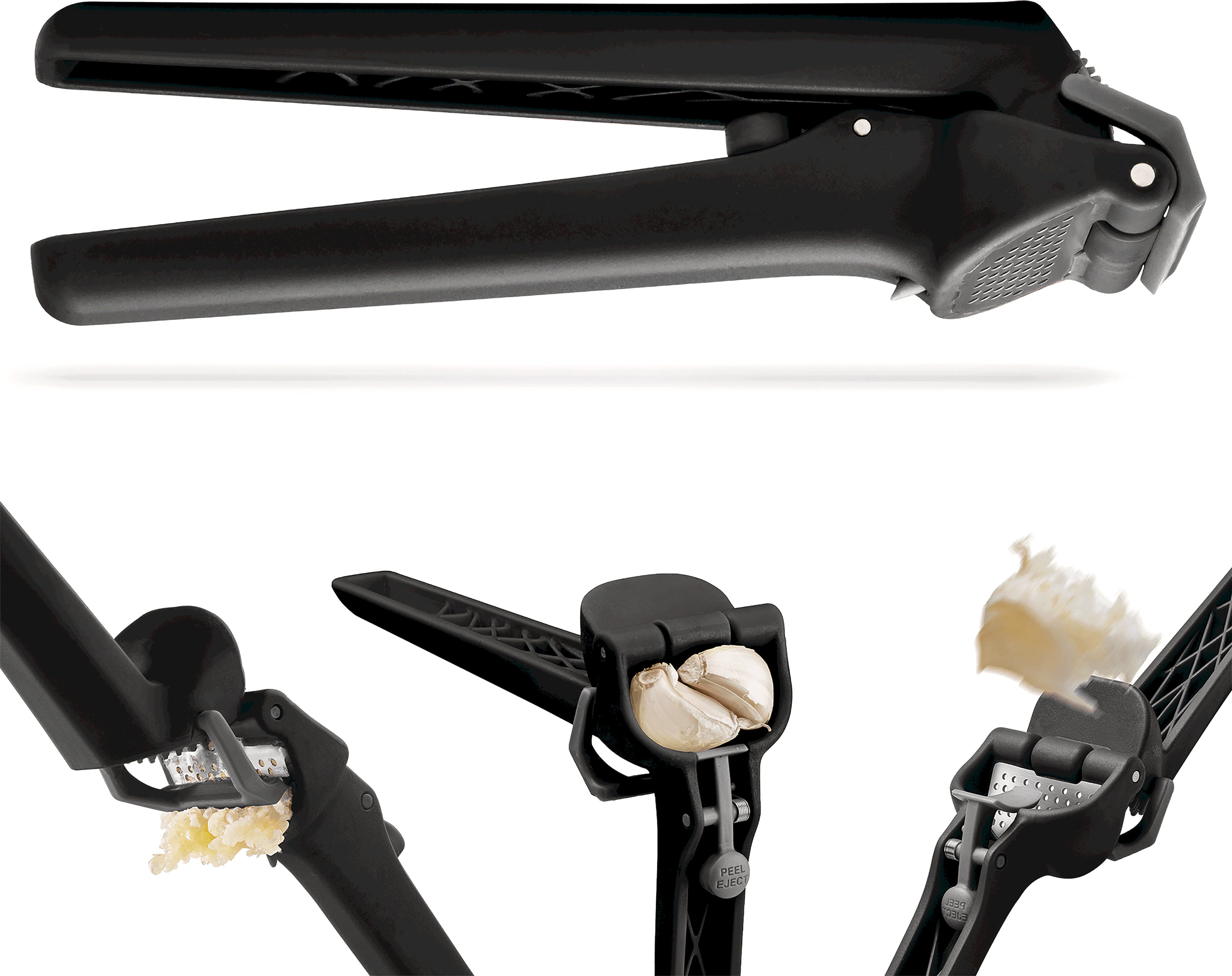 Lorsque l’ustensile est ouvert, un grattoir automatique élimine les résidus à l’intérieur, tandis que l’ingénieux bouton « Peel Eject » expulse facilement les peaux. Les mains restent ainsi propres et le presse-ail est immédiatement prêt à être réutilisé après un simple rinçage.