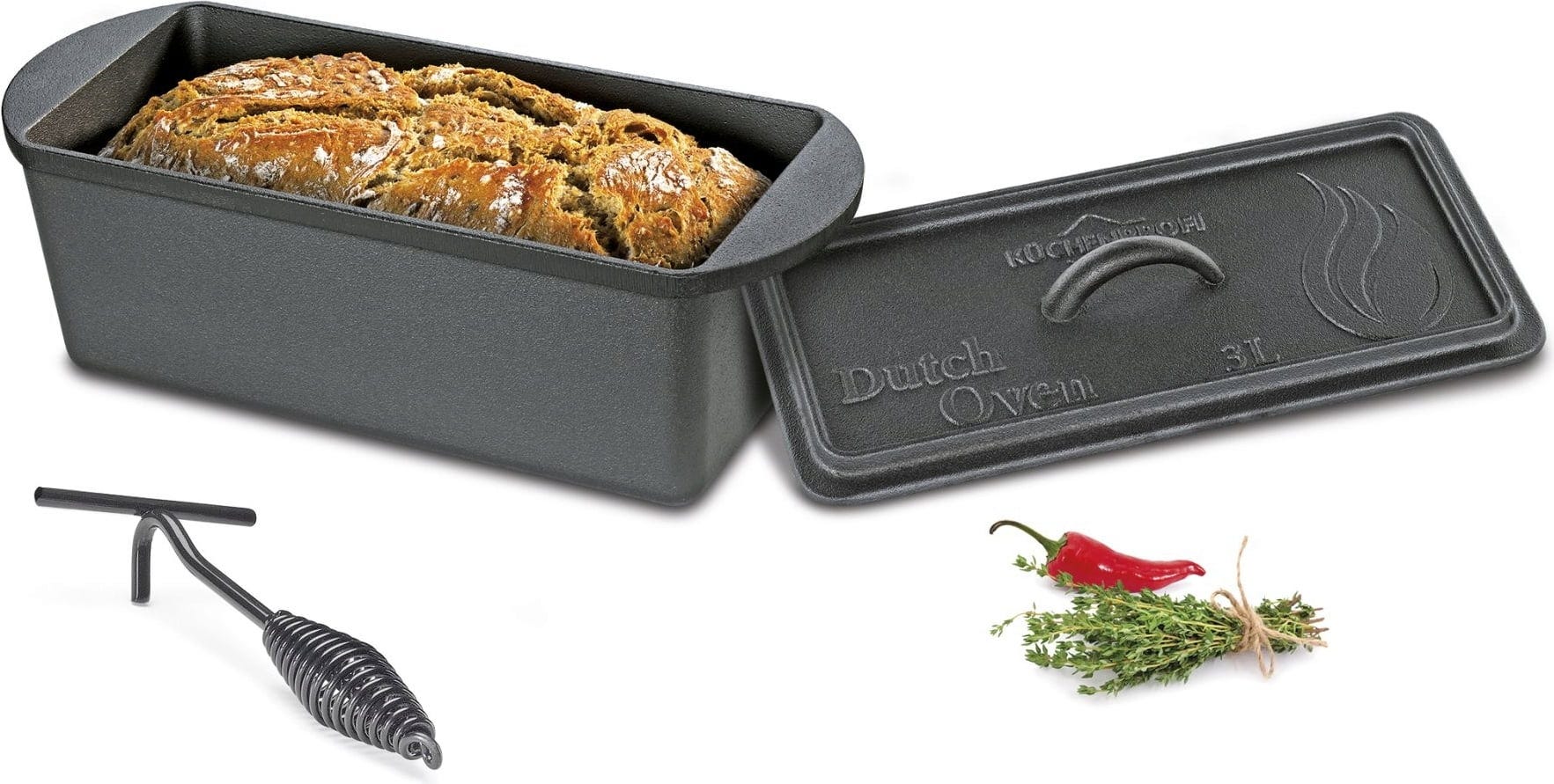 Ce moule en fonte avec couvercle est parfait pour le pain et les gâteaux, mais aussi pour les gratins et les rôtis mijotés directement sur le grill.