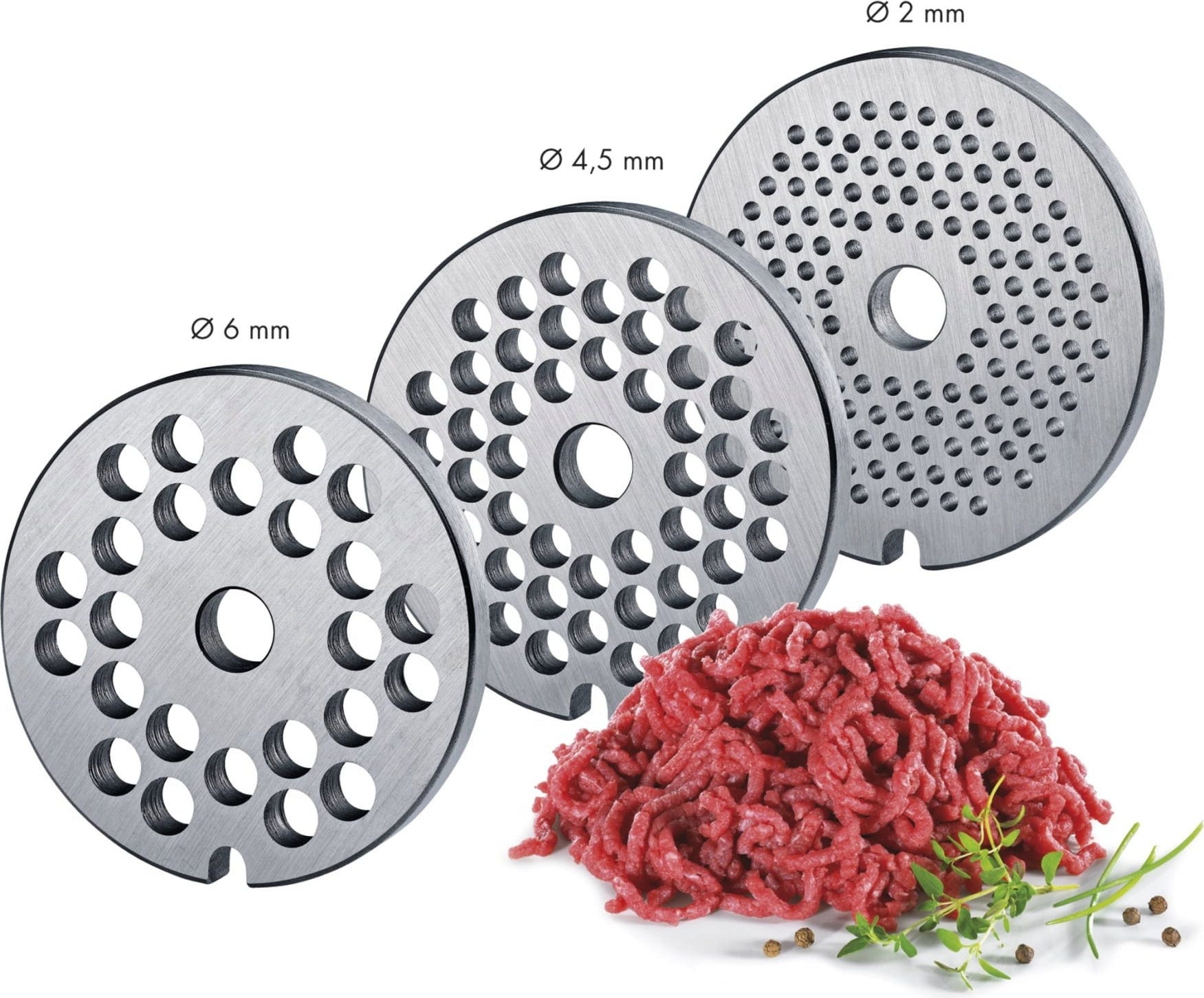 Contenu : Hachoir, 3 grilles de coupe en acier (2 / 4,5 / 6 mm), 3 embouts à saucisse (15 / 19 / 23 mm), embout pour chichis (4 formes)