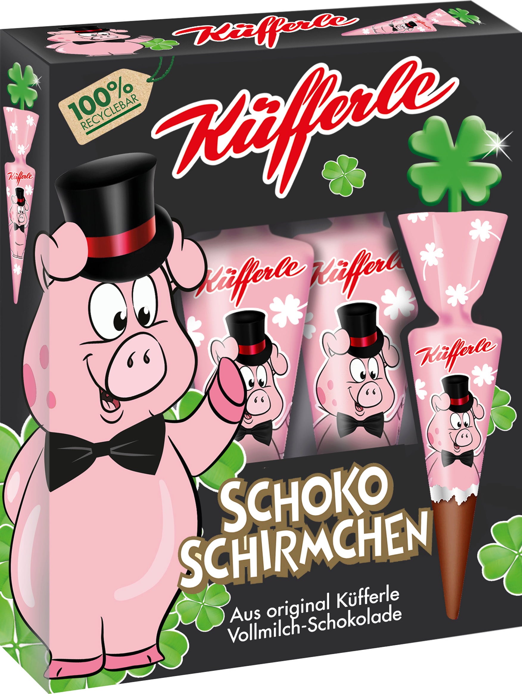 Ce drôle de cochon porte-bonheur représenté sur ces parapluies en chocolat est parfait pour souhaiter la bonne année. Chaque paquet contient quatre parapluies en chocolat au lait Küfferle avec un manche en forme de trèfle à quatre feuilles. Une bonne idée pour terminer le dîner de la Saint-Sylvestre et souhaiter bonne chance pour l'année à venir !