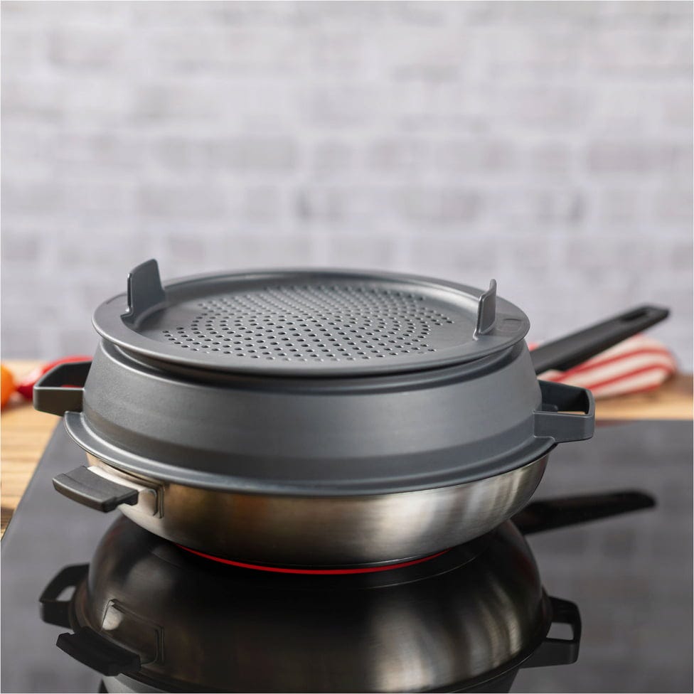 Le complément parfait pour les poêles à frire SMART & COMPACT, à combiner avec la passoire / projection anti-projections 2 en 1.