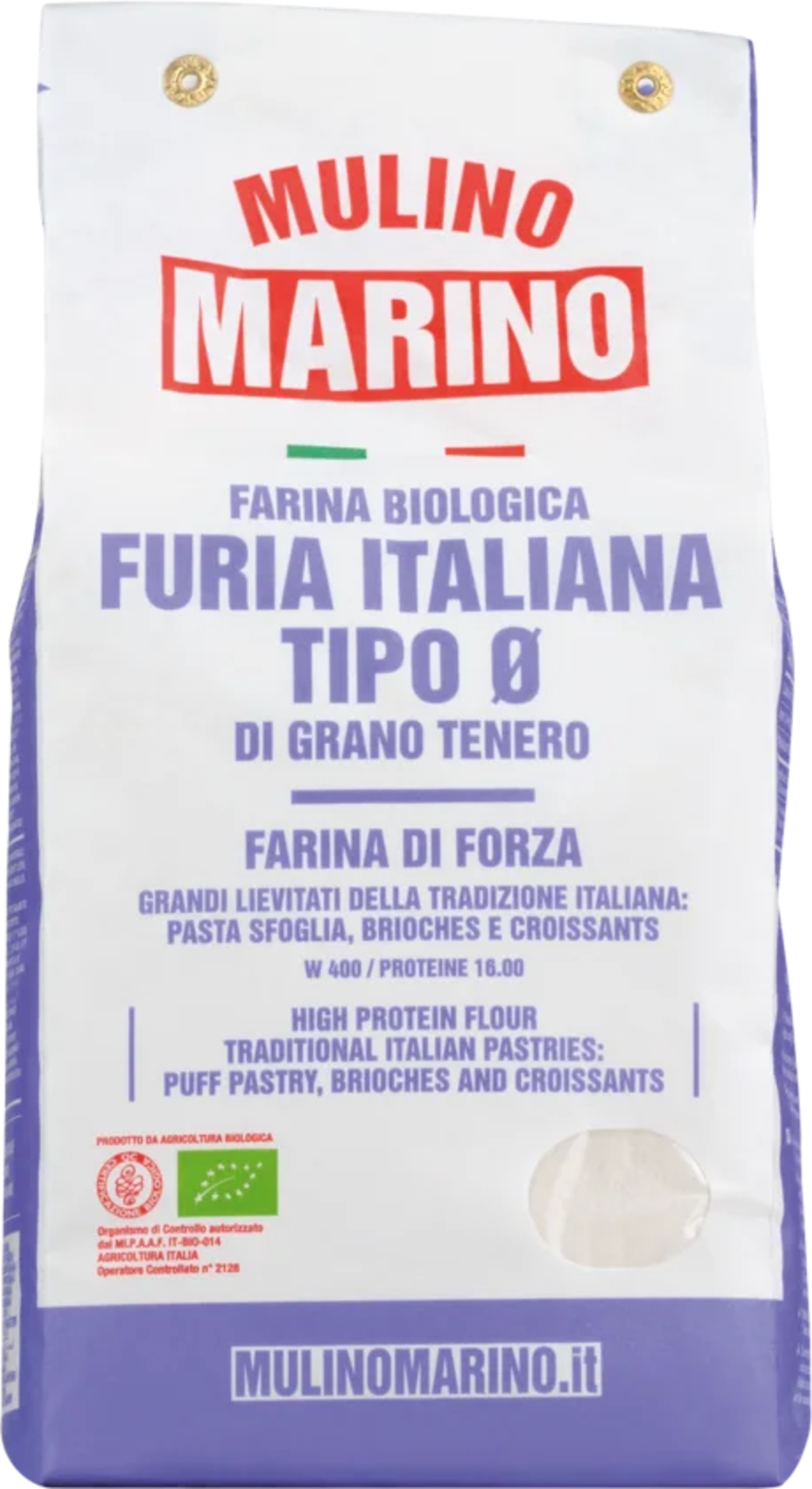 La farine Furia Italiana de Mulino Marino est une farine de blé tendre de type 0, spécialement développée pour les préparations à longue fermentation. Grâce à sa teneur naturellement élevée en protéines, elle offre une grande force, permettant de retenir efficacement les gaz durant la fermentation et de conférer à la pâte une structure exceptionnelle. Le mélange de blés tendres biologiques sélectionnés est travaillé à Cossano Belbo, dans le Piémont, sans ajout d’additifs ni de stabilisants artificiels.