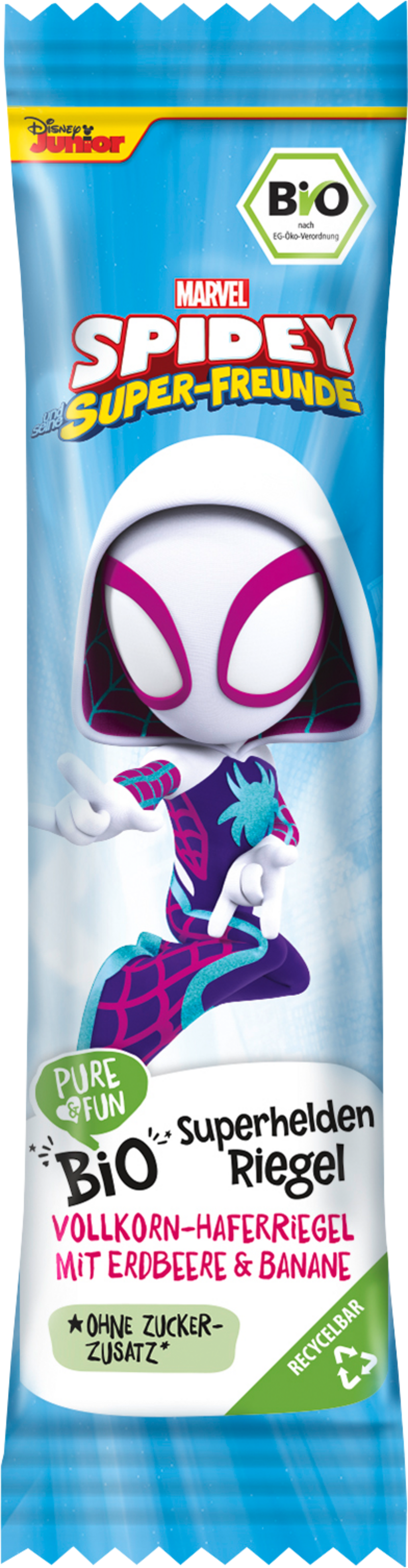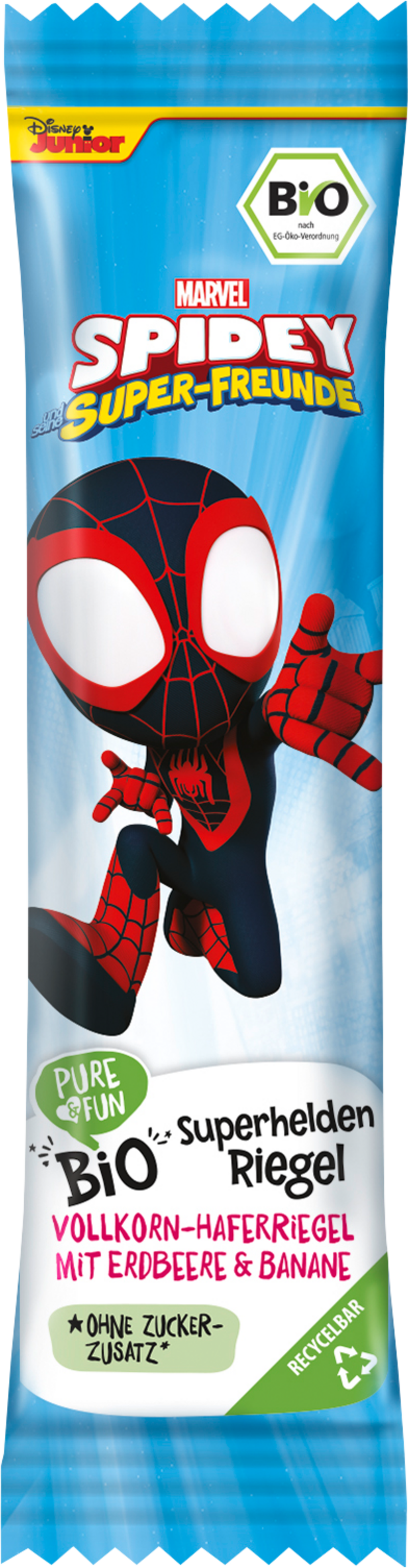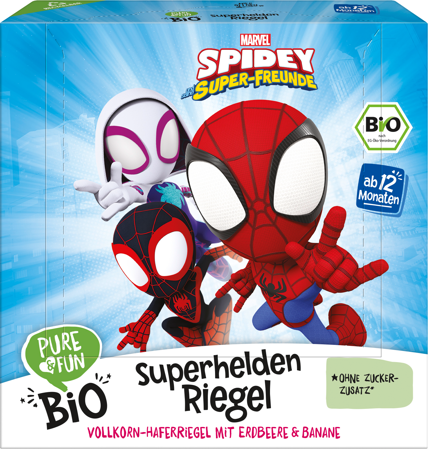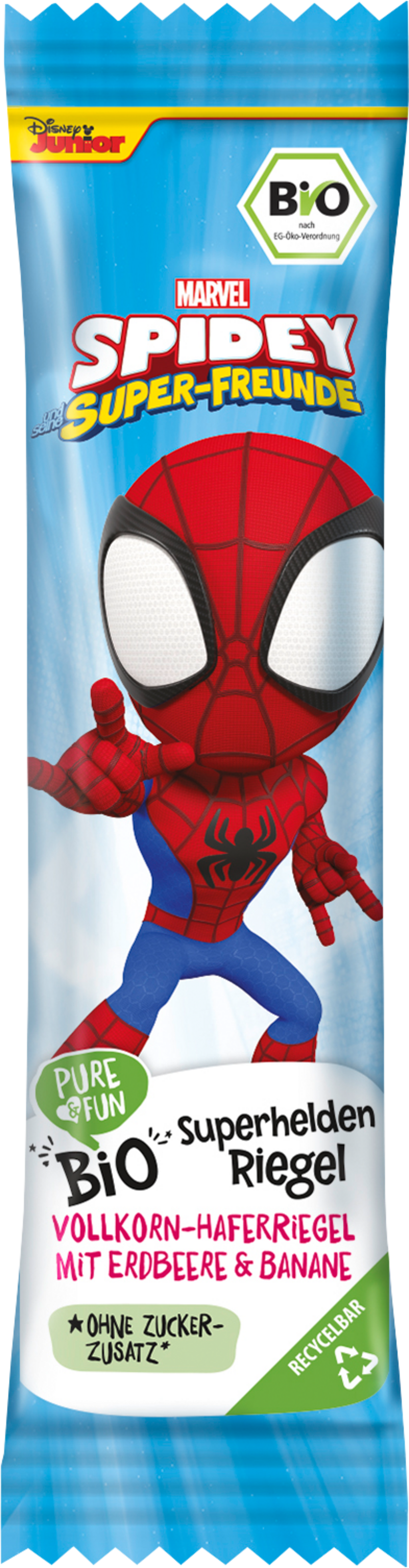 Lorsque les super-héros font une pause entre deux aventures palpitantes, nos barres Spidey sont le snack idéal ! Grâce à leur savoureux goût de fraise et de banane, tu fais le plein d’énergie pour ta prochaine mission. Naturellement en qualité bio et sans sucres ajoutés.