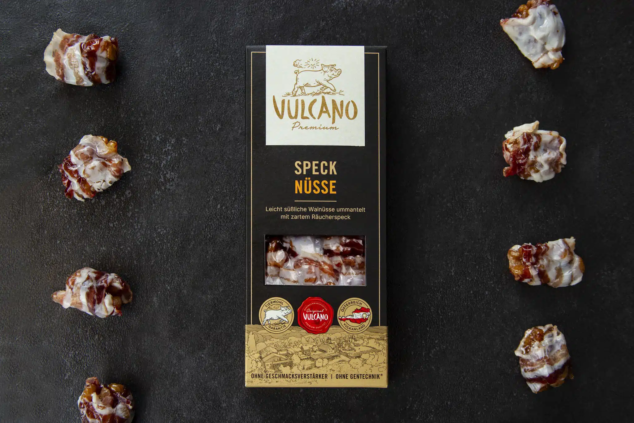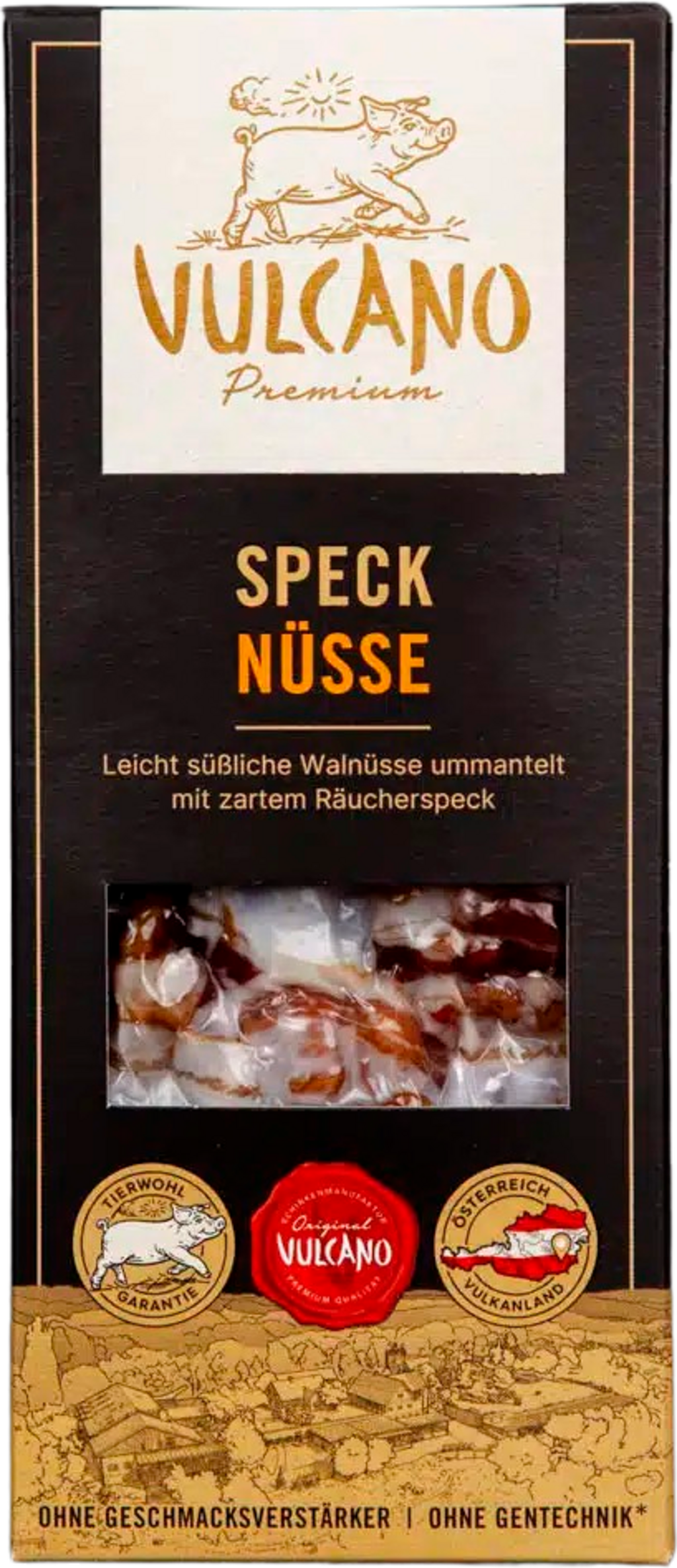 Les noix séchées sont enrobées de bacon tendre légèrement fumé et peuvent être dégustées crues, en cas de petite faim, mais également grillées brièvement à la poêle pour être servies seules en entrée ou pour agrémenter une salade ou un chutney.