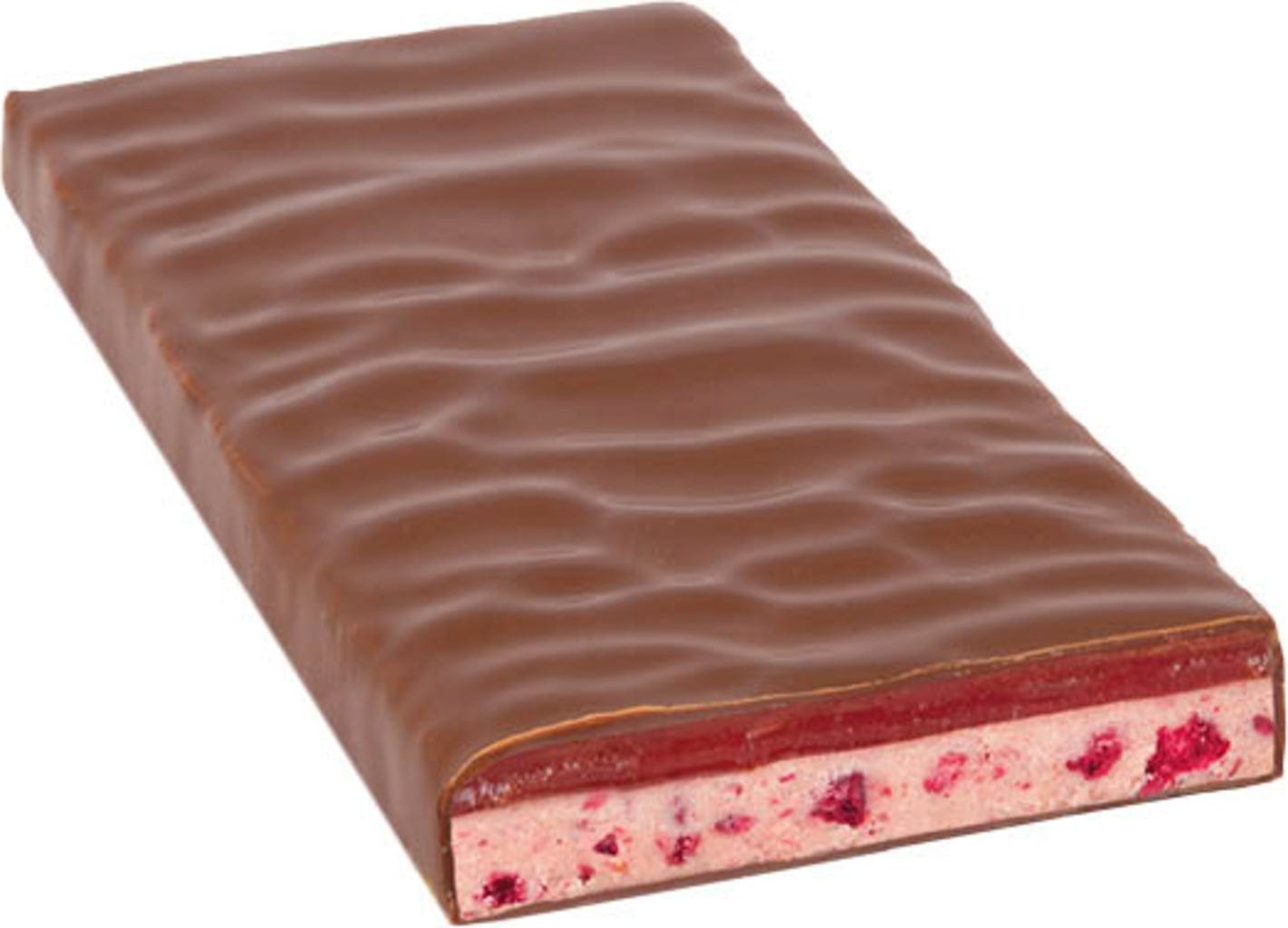 Chocolat au lait noir avec caramel à la framboise et nougat aux fruits